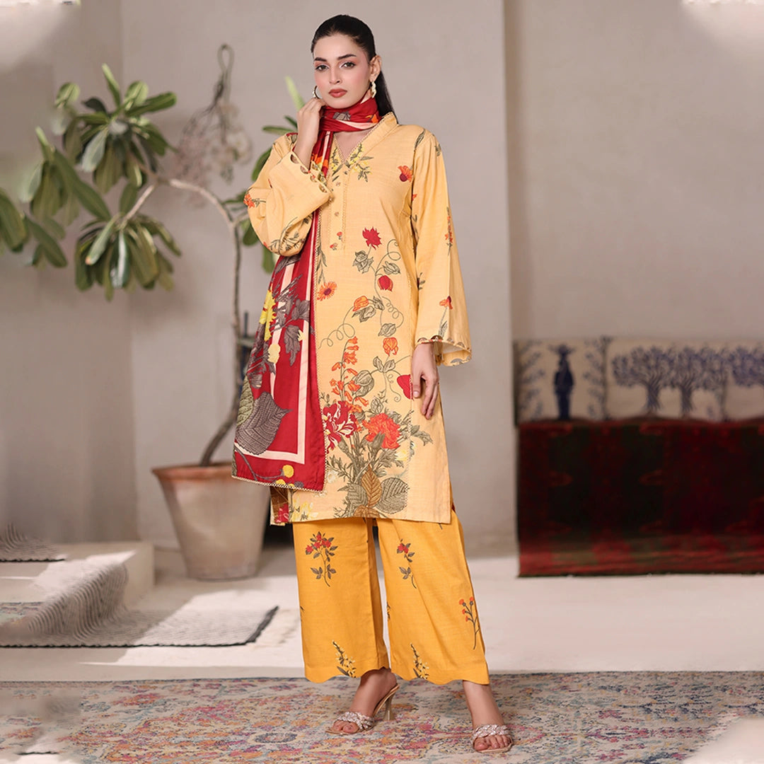 Amber captures the warmth of sunlight in rich mustard hues, designed for days that call for both comfort and character. The khaddar shirt blooms with a soft floral print, brought to life through a V-neckline framed with delicate lace detailing. Fabric-covered buttons trace the front placket, while subtle pleats and lace along the princess lines and sleeve joints lend graceful movement. The coordinating printed trouser completes the look, while the Marina wool shawl, printed and finished with lace on all four sides, adds a cozy yet refined touch — an effortless choice for the modern woman’s everyday elegance.