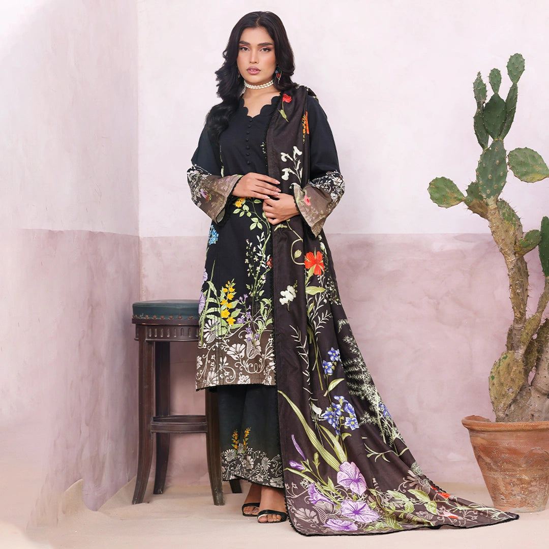 Saaya brings quiet sophistication to the season in deep charcoal tones. The straight-cut khaddar shirt features a scalloped neckline with fabric-button detailing and fine pin-tucks that add subtle structure to its front panels. Printed sleeves trimmed with lace add an understated charm, balanced perfectly with a coordinating printed trouser. Completing the look is a soft Marina wool shawl — delicately printed and finished with lace detailing along all four sides, designed to wrap you in effortless elegance and warmth.